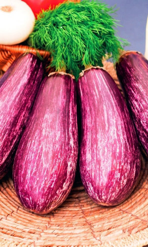 Среднеспелый сорт для открытого грунта и плёночных укрытий. Растение полураскидистое, высотой 63-75 см. Плоды овально-грушевидной формы, полосатые, с чередованием белых и ярко-выраженных розово-фиолетово-сиреневых полос, массой 250-400 г. Мякоть белоснежная, без...
