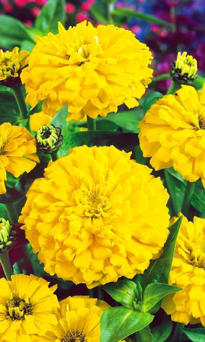 Мощные, ветвистые кусты, до 90 см высотой, несут крупные махровые, лимонно-жёлтые соцветия, до 10 см в диаметре.Посев: март - апрель на рассаду. Через 3-4 недели после всходов сеянцы пикируют. В открытый грунт рассаду высаживают, когда минует угроза заморозков. Расстояние...