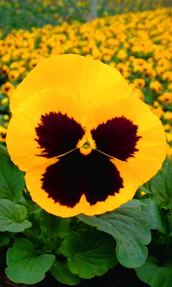 Группа Швейцарские гиганты. Растение с быстрым ростом, красиво и обильнооблиственное, с исполинскими цветками, сидящими на короткой и твердой цветоножке. Цветки 8 см в диаметре, верхние лепестки жёлтые, на 3-х нижних – пятна у основания лепестков.Высота растения 15 см...