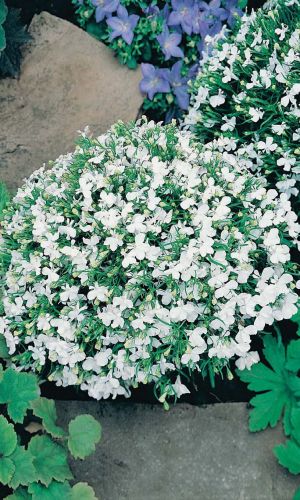 Цветок до 1 смРаннецветущая серия. Красивое травянистое растение с бронзовой листвой, сплошь усыпанное белыми цветками, диаметром 1 см. Кустик очень компактный, густоветвистый, высотой 15 см. Цветёт с июня по сентябрь. Используют для обрамления клумб, бордюров, рокария, балконных ящиков и подвесных корзин.