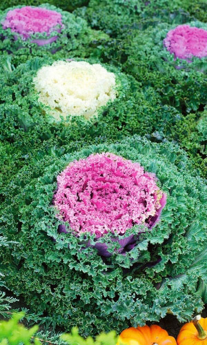 Холодостойкая смесь декоративной капусты для осенних цветников. Розетки листьев рыхлые, высотой и диаметром 30 см. Окраска двухцветная, с установлением прохладной погоды приобретает наиболее эффектные, яркие оттенки. Растения используются для оформления бордюров, садовых вазонов и создания оригинальных композиций в смешанных цветниках...