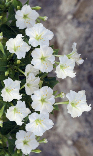 Многолетнее растение, используется как однолетнее. Большие, благоухающие кусты мирабилиса, сплошь усыпанные яркими звездочками цветов, создают неповторимую атмосферу в вечернем саду. Ароматные, белоснежные цветки раскрываются после 15 часов, а закрываются утром. Цветёт...