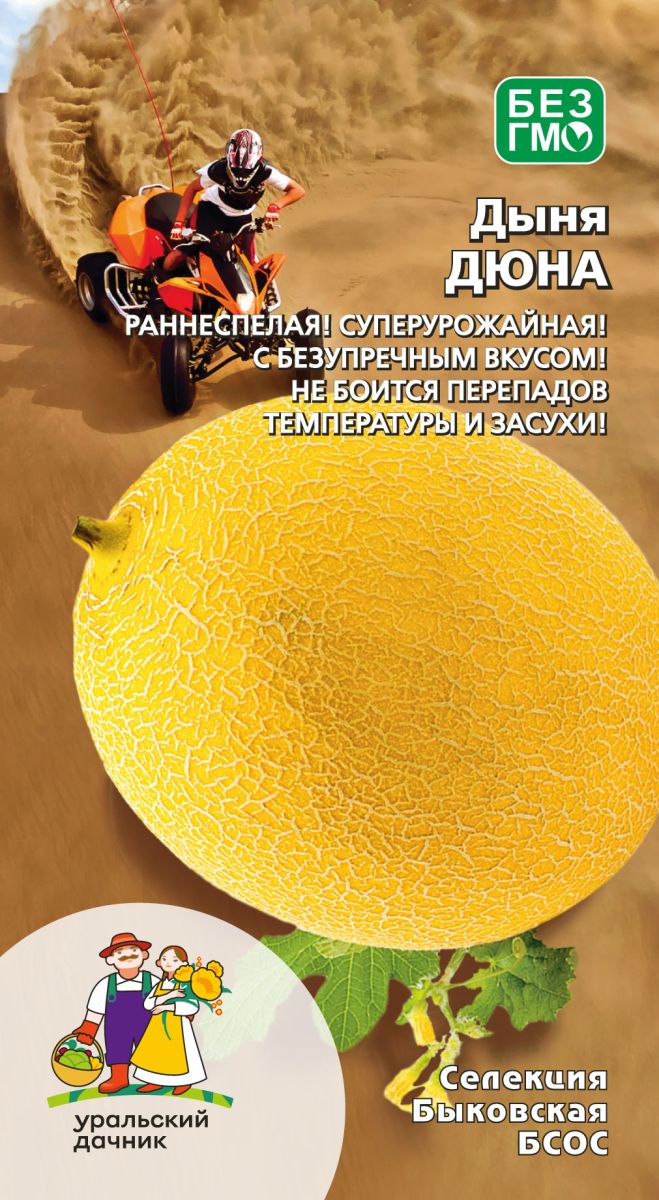 Открытый грунтCорт среднепоздний, 75-80 дней, дружно созревающий, урожайный. Плоды ребристые, привлекательного внешнего вида – ярко-жёлтые с эффектными зеленовато-жёлтыми полосами, скрытыми поверхностной сеткой. Мякоть светло-жёлтая, среднеплотная, сочная с содержанием сухих...