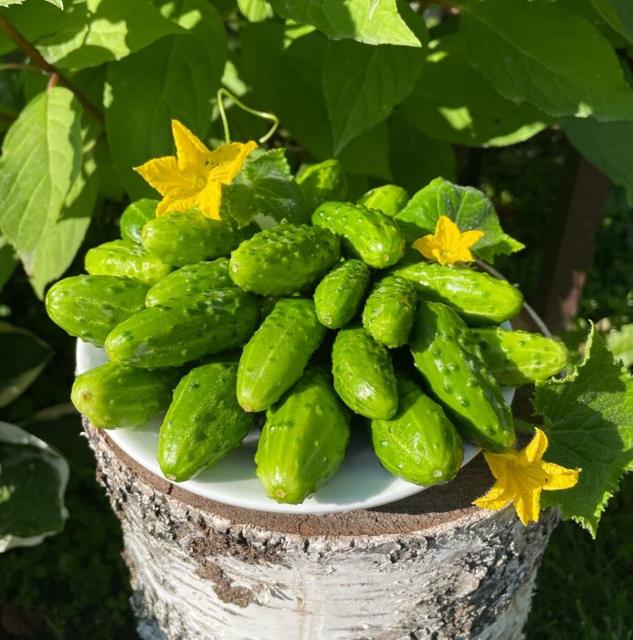 Это редкая удача селекционера. Действительно, чтобы в одном и том же гибриде сочетались раннеспелость, великолепный вкус, огромная урожайность, отличный внешний вид плодов, могучий красивый куст, – такое встретишь нечасто. Очень урожайный суперпучковый гибрид женского типа цветения для выращивания в открытом грунте, весенних теплицах, тоннелях. Ветвление ограничено. Зеленцы корнишонного типа, крупнобугорчатые, белошипые, длиной 8-12 см, очень высоких засолочных качеств. Гибрид «запрограммирован» на интенсивное производство короткоплодных (до 5-6 см) пикулей и мини-корнишонов. Суперпучкового типа завязей, до 10 штук в узле, при этом налив плодов в узлах последовательный. При хорошем опылении почти все завязи становятся зеленцами, что даёт потенциально высокую урожайность. Устойчив к оливковой пятнистости, вирусу обыкновенной огуречной мозаики, толерантен к мучнистой и ложной мучнистой росе.