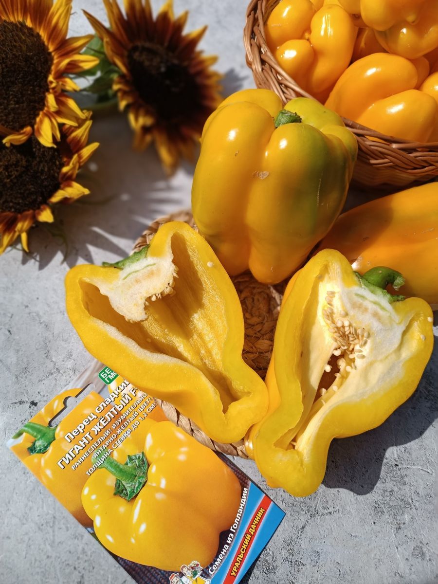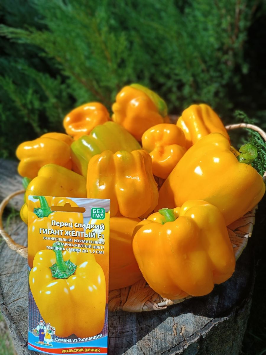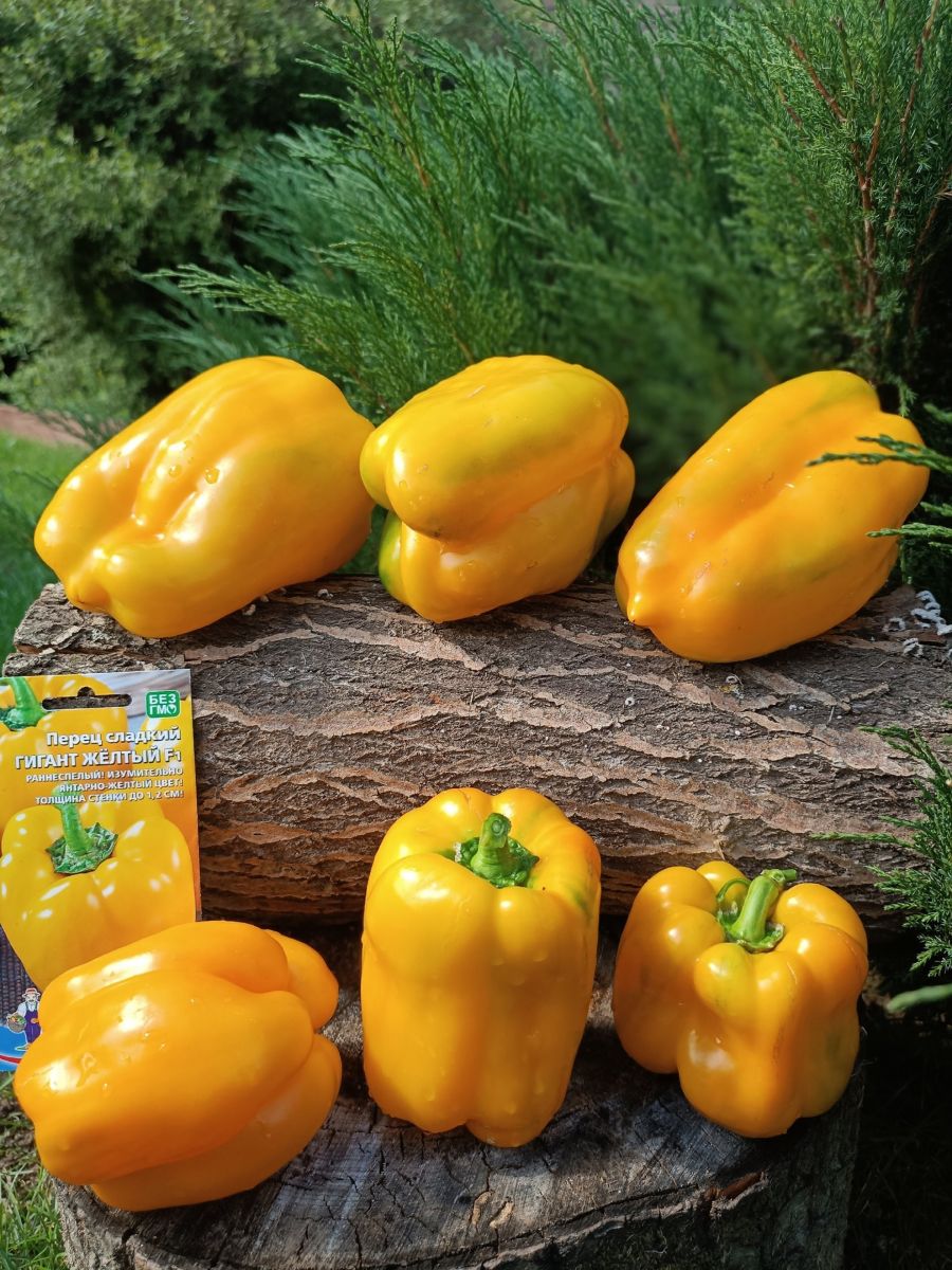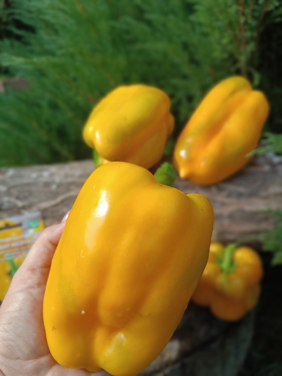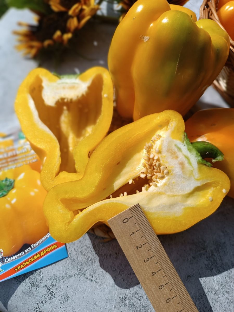 Раннеспелый крупноплодный гибрид с обильным и продолжительным плодоношением. Высота растения до 80 см. Плоды изумительного янтарно-жёлтого цвета, массой до 250 г, толщина стенки до 1,2 см, плотные, сочные, очень сладкие.