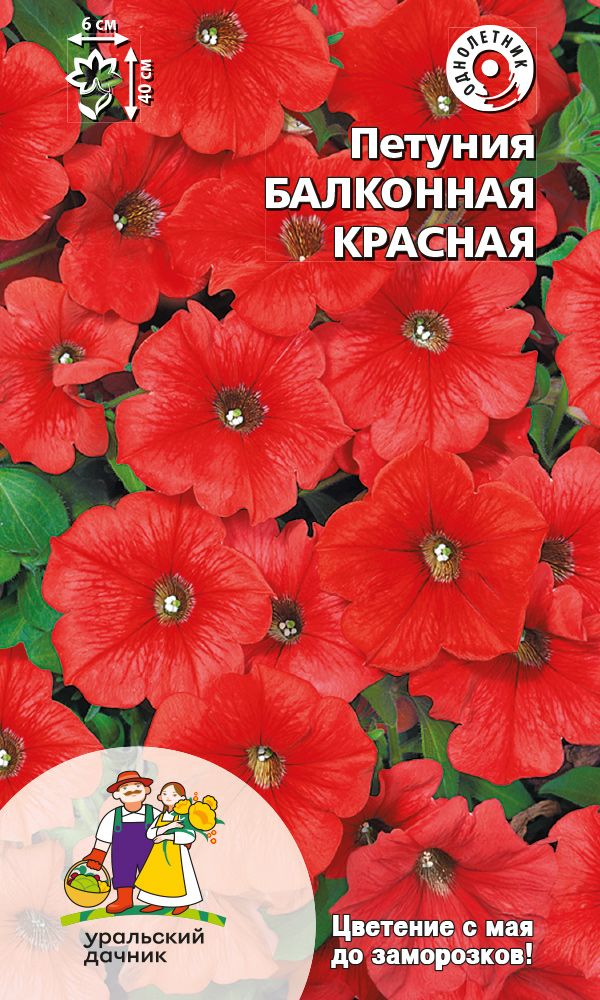 ОднолетнееАмпельная обильноцветущая петуния. Стебли свисающие, гибкие, длиной 35-40 см, равномерно усыпаны огромным количеством красных цветков Ø6-8 см. Цветение раннее и продолжительное, с мая до окончания сезона. Растения прочные, хорошо переносят воздействие дождя и ветра, не теряя своей декоративности. Петуния светолюбива, засухоустойчива, хорошо адаптируется к любым условиям выращивания. Идеально подходит для выращивания в подвесных корзинах, кашпо и балконных ящиках.