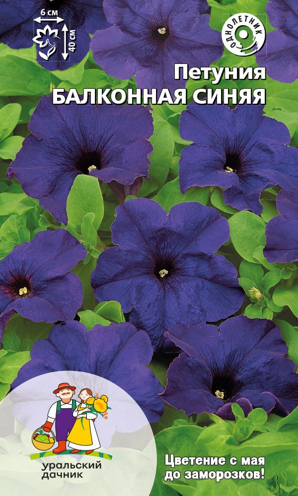 ОднолетнееАмпельная обильноцветущая петуния. Стебли свисающие, гибкие, длиной 35-40 см, равномерно усыпаны огромным количеством насыщенно-синих цветков Ø6-8 см. Цветение раннее и продолжительное, с мая до окончания сезона. Растения прочные, хорошо переносят воздействие дождя и ветра, не теряя своей декоративности. Петуния светолюбива, засухоустойчива, хорошо адаптируется к любым условиям выращивания. Идеально подходит для выращивания в подвесных корзинах, кашпо и балконных ящиках.