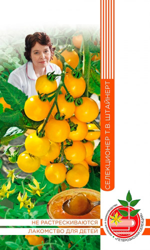 Высокоурожайный, среднеспелый сорт для всех видов теплиц. Период от всходов до начала созревания 110-115 дней. Растение индетерминантное, высотой более 2 м. В одной кисти насчитывается 8-10 плодов. Плоды сливовидной формы, гладкие, тёмно-жёлтого цвета, массой 70-90 г. Мякоть...