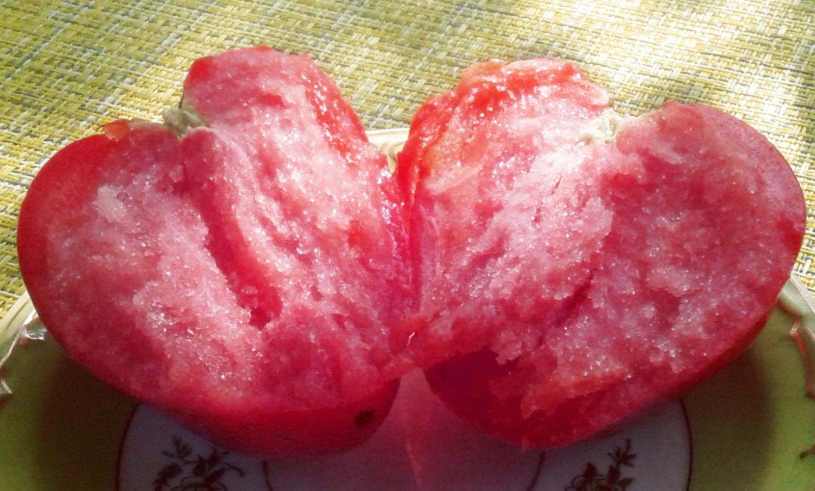 Форма плода сердцевидная, камер 8-9. В зрелом виде окраска плода – малиновая, вершина выпуклая, углубление сильное, плодоножка с сочленением. Плод гладкий, малинового цвета, крупный, достигает 600 г. Сорт среднеспелый, вегетационный период 127 дней. Химический состав плодов (%): сухое вещество – 6,8-6,9, моносахара – 4,8-5,9, кислотность – 0,30-0,40, содержание аскорбиновой кислоты 15,3-23,5 мг%. Вкусовые качества плодов отличные.