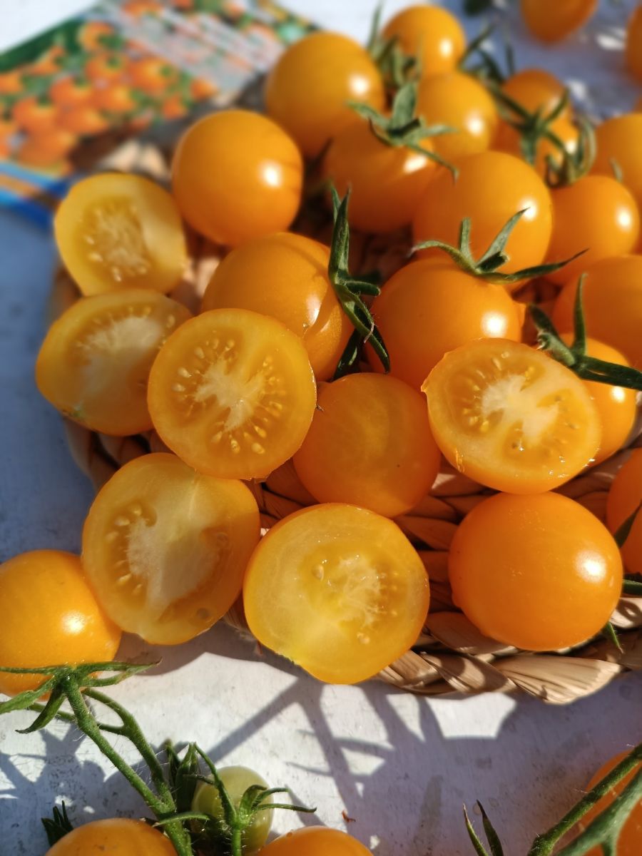 Плоды по 15-18 г, практически не растрескиваются, янтарно-оранжевого цвета, правильной круглой формы, с ароматнейшей, сочнейшей и нежнейшей мякотью. Вкус, как и вид томатов, необыкновенный – с незабываемым фруктовым послевкусием. Ими просто невозможно насытиться! Будто какая-то магическая сила тащит вас к этому «золотому» кусту, а в голове: «Моя прелесть!..», помните, как во «Властелине колец»?