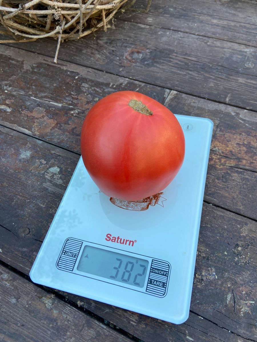 Слабооблиственный, лёгок в уходе и формировке. Высокая завязываемость до последней кисти. Сердцевидные плоды малиновой окраски достигают и превосходят килограмм. Салатного назначения. Мякоть сладкая на изломе зернистая.