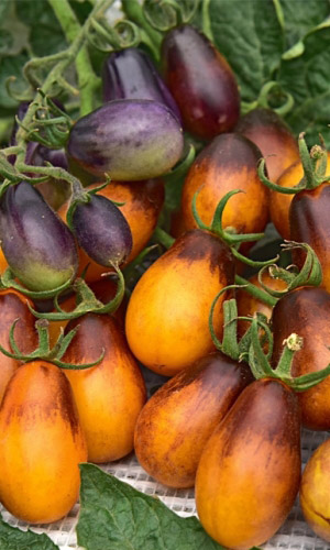 Новый вкусный гибрид с оригинальной окраской созревших плодов. Два оттенка спелых слив – густой фиолетовый и насыщенный жёлтый слились воедино в каждом томате. Грушевидные плоды массой по 40 грамм с высоким содержанием антоциана и каротина. Растения высотой 90-150 см в идеальных условиях каждое потенциально могут дать до 300 красивых и полезных плодов!