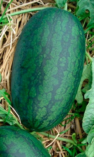 Гибрид невероятно раннего срока созревания, от всходов до первых плодов всего 39-45 дней. Образует крайне интересные мини-плоды: от овальной до слегка удлинённой формы. Средняя масса около 1-1,2 кг, но некоторые ягоды достигают 2-х и более кг. Окраска слегка полосатая, у...